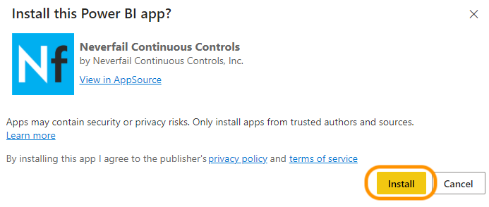After a moment, the app will open in the Power BI website, and a window will prompt to name the workspace and install the app. If you cannot install it, a Pro license may not be available.