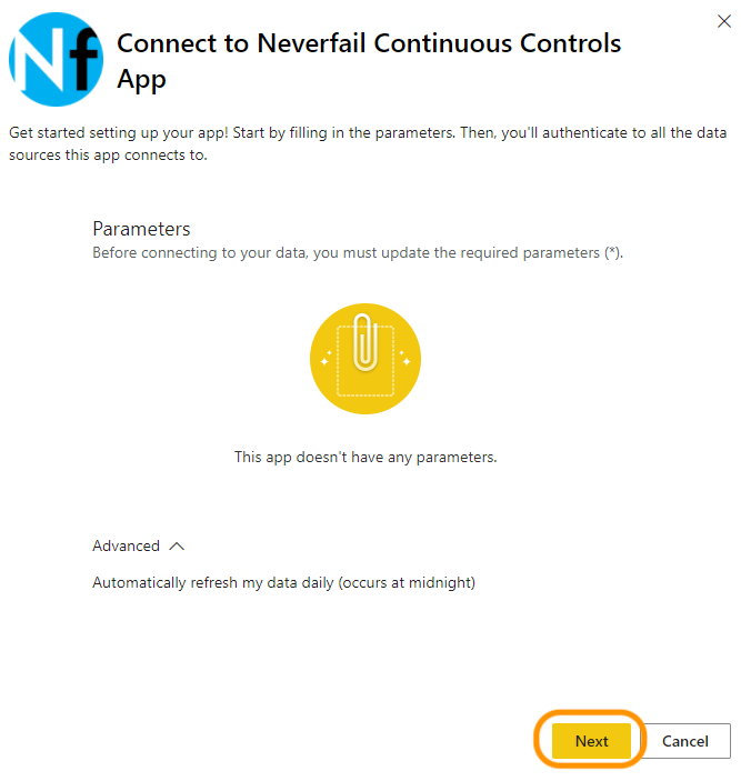 Power BI should indicate that there are no parameters to the app, proceed and click Next.