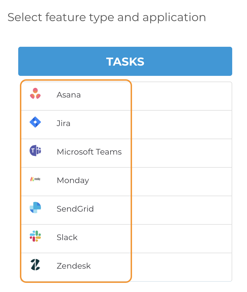 On the next Feature Type screen, under the TASKS column, select the supported task application you wish to configure.